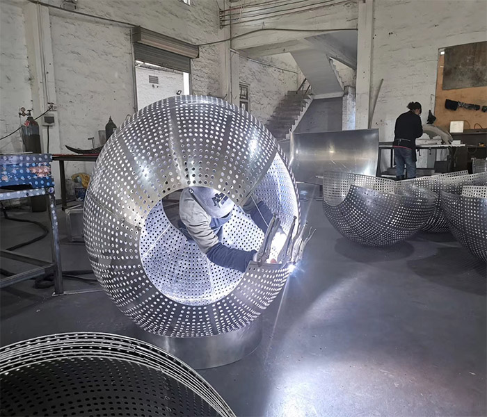 弧形铝单板天花一般采用2.5mm或3.0mm厚的铝板材料,首先根据造型设计要求现场量好尺寸,由专业的设计师通过CAD设计造型图纸,有些造型尤其是对曲线要求较高的造型,还需根据要求放样,利用木板等易加工成型的材料制作出1:1大小的实物模型,然后通过CAD图纸不断的校准度量,设计出曲线优美造型特异的波浪造型天花。设计师完成图纸设计后,通过电脑精密雕刻开料,雕刻出波浪形的铝板坯料,然后由经验丰富的氩弧焊师傅经过烧焊拼接,制作出波浪形天花坯料,再经过精细手工打磨、抛光、校准定型,完成后一道工序烤漆,即可制作出造型独特美观的弧形吊顶天花。