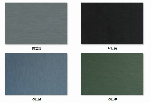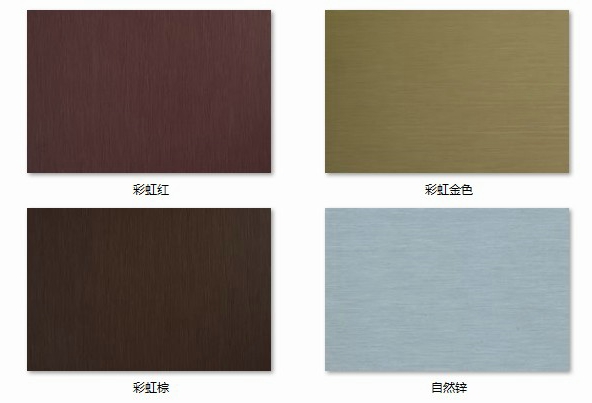(7)面板颜色除金属本色外,亦可预处理成板岩灰、彩虹蓝、彩虹绿、彩虹红、彩虹金等颜色。