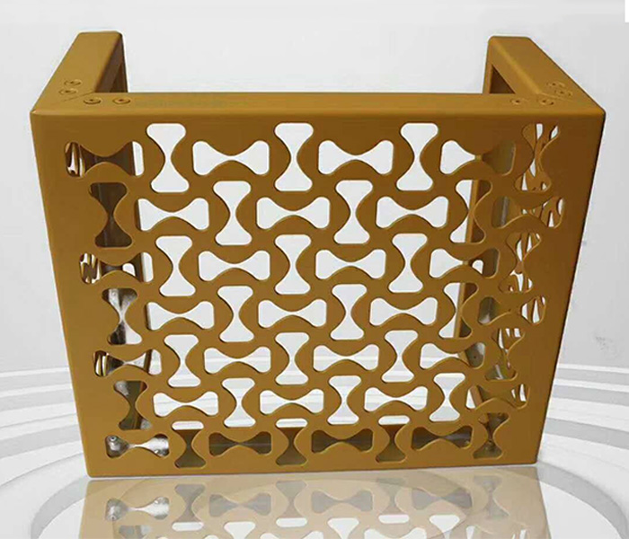 铝合金空调罩采用高强度铝合金材料制作而成,具有强度高、易安装、外形美观等特点。其主体结构根据室外空调主机尺寸使用整块铝合金板冲压钣金而成,大面积的开口有利于气流的流动,减少风力对空调防护罩的直接作用力,大大增加铝合金空调罩的强度。克服过去大面积外墙百叶受风力或气压影响出现的脱落现象。广泛用于美化小区楼盘,遮掩室外空调主机,美化楼宇建筑的外观。有着美观大方、散热良好、坚固耐用的特点。空调保护罩在折角处采用加强筋进行加固。能有效延长您的空调使用寿命!